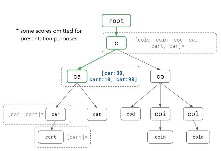 为了让 Autocomplete 服务在用户使用时达到极低的延迟,我们需要对流行指数数据库中存储的信息做预处理。考虑到用户请求本质上是根据前缀补全并排序,我们引入处理前缀查询专用的数据结构 Trie。Walid Wahed, Tiffany Han, Jay Shenk. (2018). How We Built Prefixy: A Scalable Prefix Search Service for Powering Autocomplete