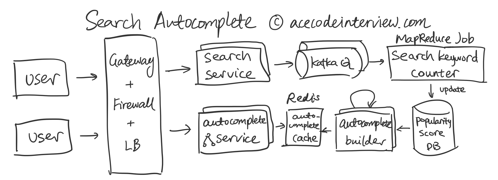 Autocomplete 主要考察两条数据流,一是如何收集高频搜索关键词,二是如何实时补全用户打了一半的关键词前缀。