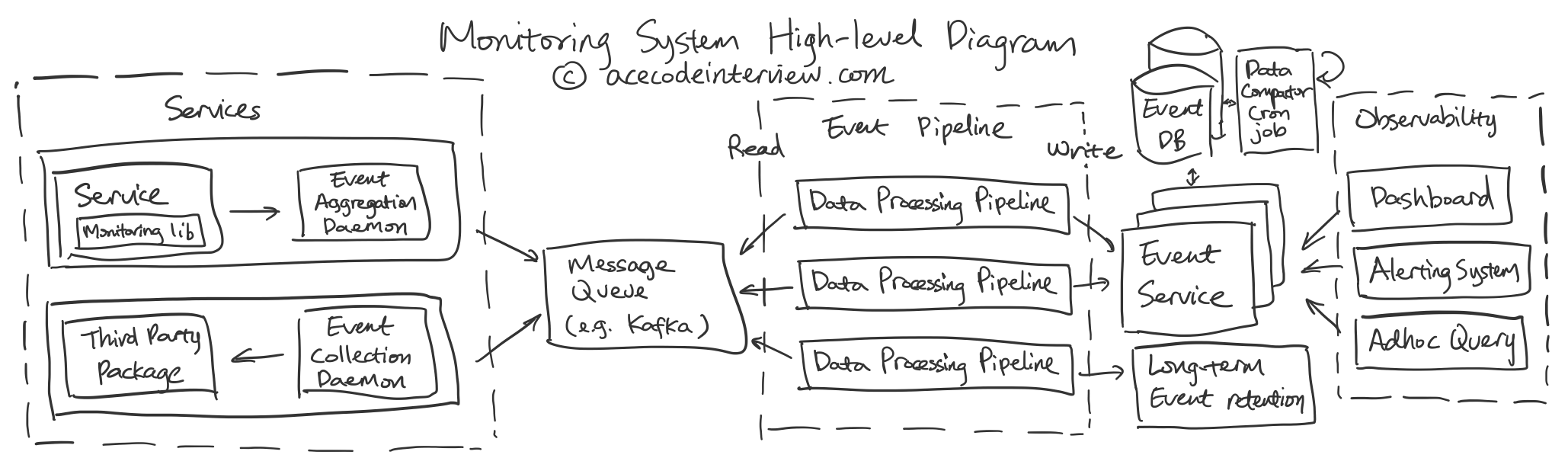实时监控系统是每一个网络服务的刚需,每个后端工程师都多多少少接触和使用过。 这道题主要考察 Streaming Service 的应用,监控系统作为一个 Streaming Service 的经典实例,牵涉到 Streaming Service 上游的 Publisher 和下游的 Consumer 如何合理配置,来实现监控系统所涉及到的种种功能。