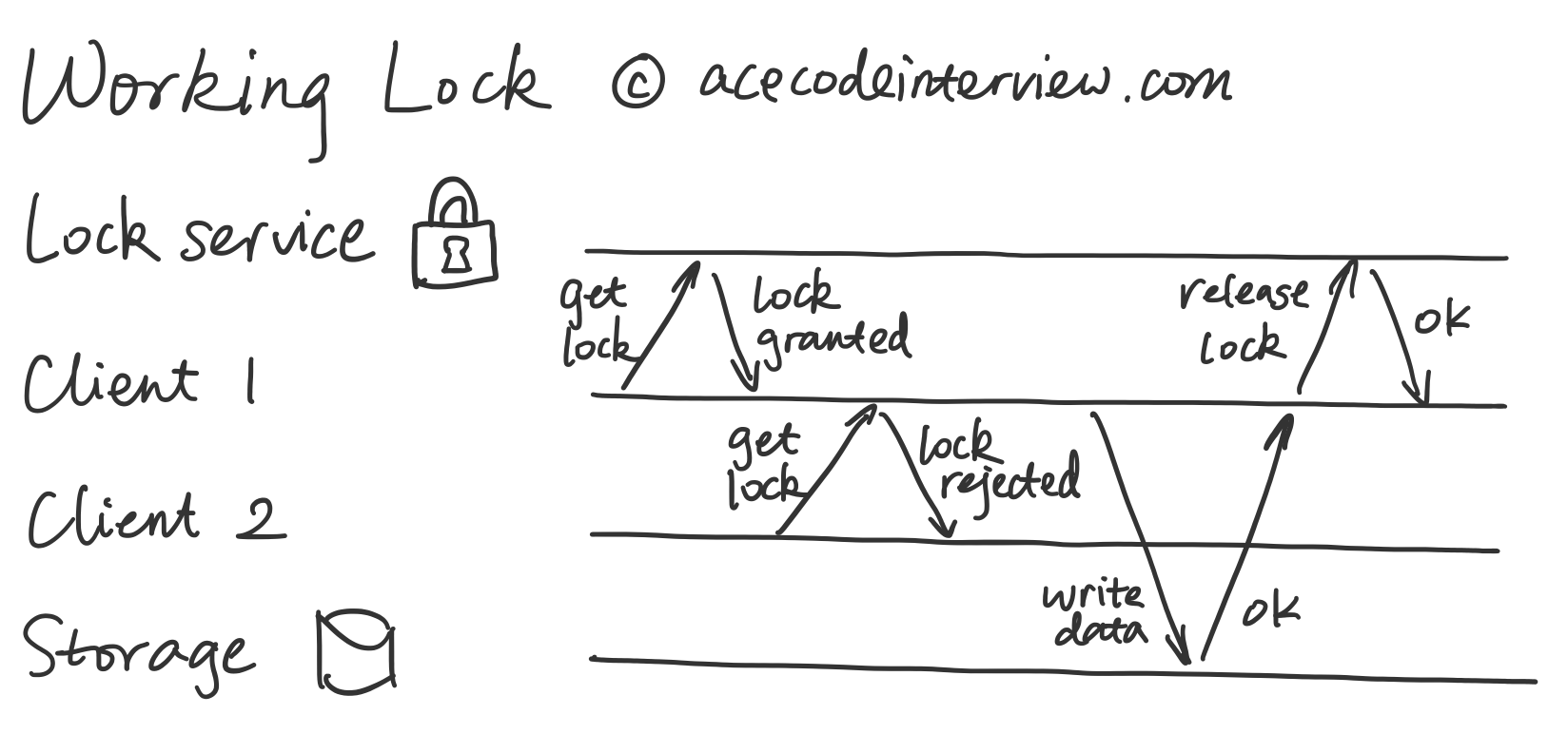 上图描述了每个客户端都正常工作的情况。客户端只需要采用跟多线程锁 (Multi-thread Lock) 一样的策略,先试图获取锁,如果成功,就开始进行运算,修改资源,最后释放锁;反之,就等待锁的释放。